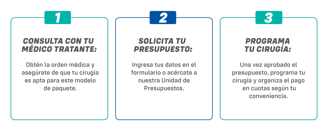 Accede a tu cirugía paquetizada conociendo el valor desde el inicio. Sin cargos inesperados, con facilidades de pago (3, 6 y hasta 12 cuotas sin interés), el respaldo de nuestro equipo médico y altos estándares de calidad y seguridad.